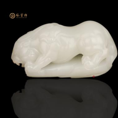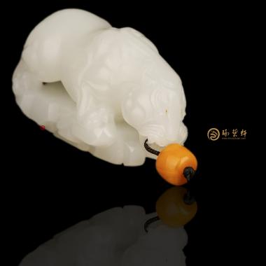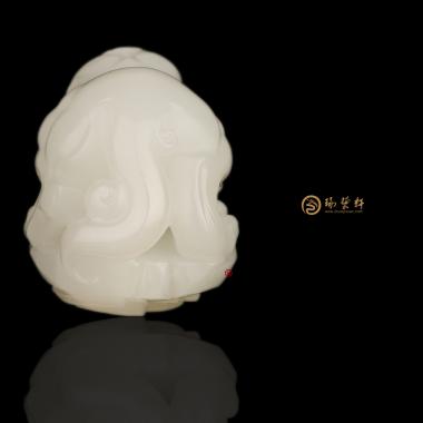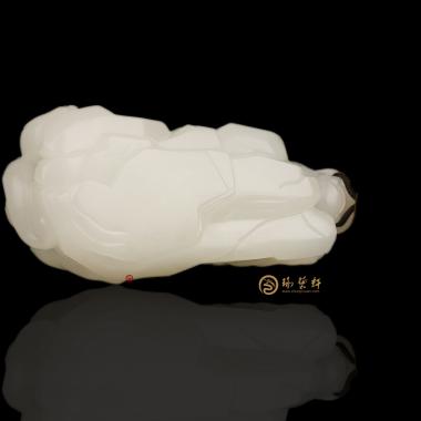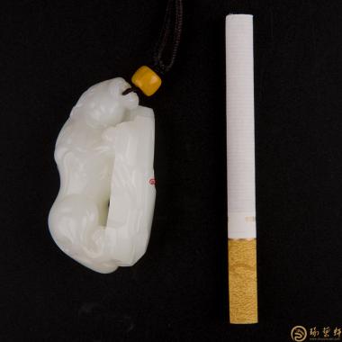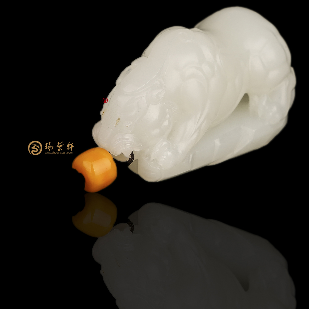 色脂白,玉质细腻,立体圆雕貔貅,貔貅神兽之一,以钱财为食,只进不出,故有招财辟邪的寓意。